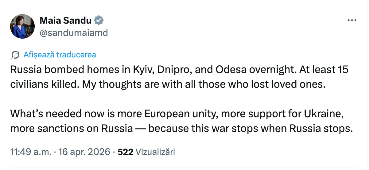 Imagine simbol„Rusia a bombardat locuințe în Kiev, Dnipro și Odesa peste noapte. Cel puțin 15 civili au fost uciși. Gândurile mele sunt alături de toți cei care și-au pierdut persoanele dragi”, a scris Maia Sandu pe rețelele sociale, transmite Știri.md.