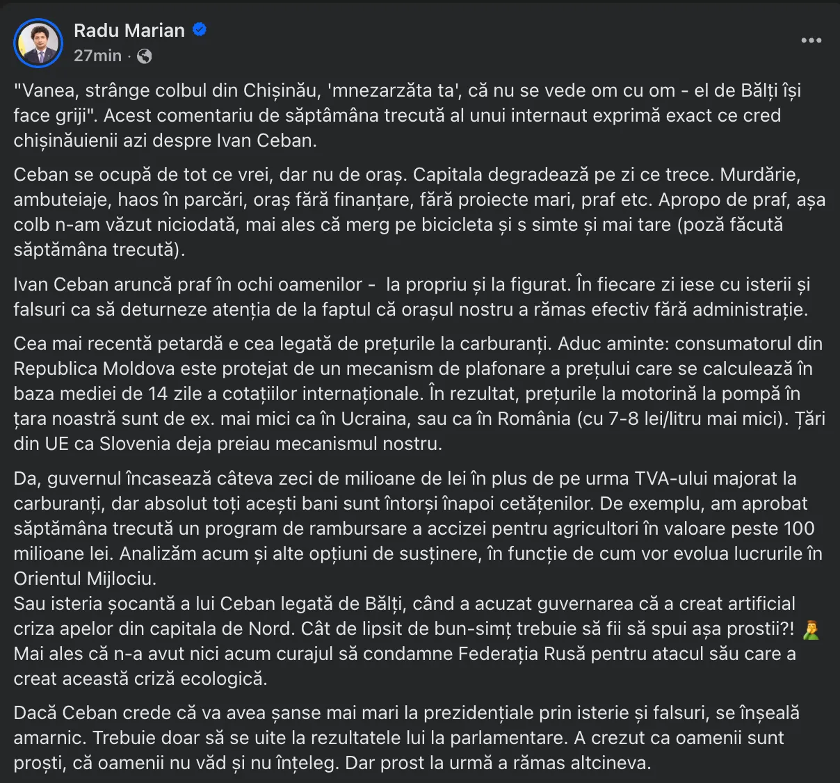 În același context, Radu Marian a criticat declarațiile lui Ion Ceban privind presupusa implicare a guvernării în criza apei din municipiul Bălți, calificându-le drept „lipsite de bun-simț”.