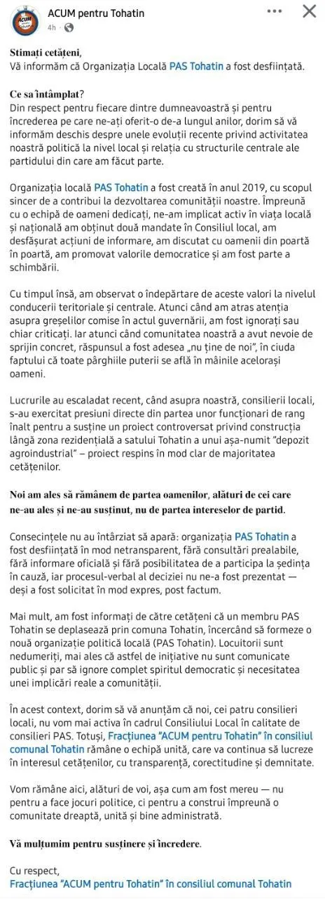 Organizația locală PAS din Tohatin a fost desființată, potrivit unui mesaj publicat de grupul „ACUM pentru Tohatin”. Într-un anunț adresat cetățenilor, consilierii locali afirmă că decizia a fost luată de conducerea teritorială și centrală a partidului, fără consultări prealabile și fără informare oficială.