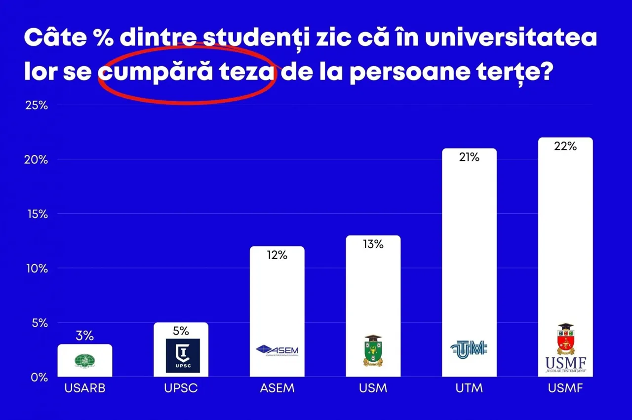 Potrivit unui sondaj recent, 14 % dintre studenții din Republica Moldova spun că, în universitatea lor, proiectele sau tezele se cumpără de la persoane terțe, iar 6 % afirmă că lucrările ar fi cumpărate de la profesori.
