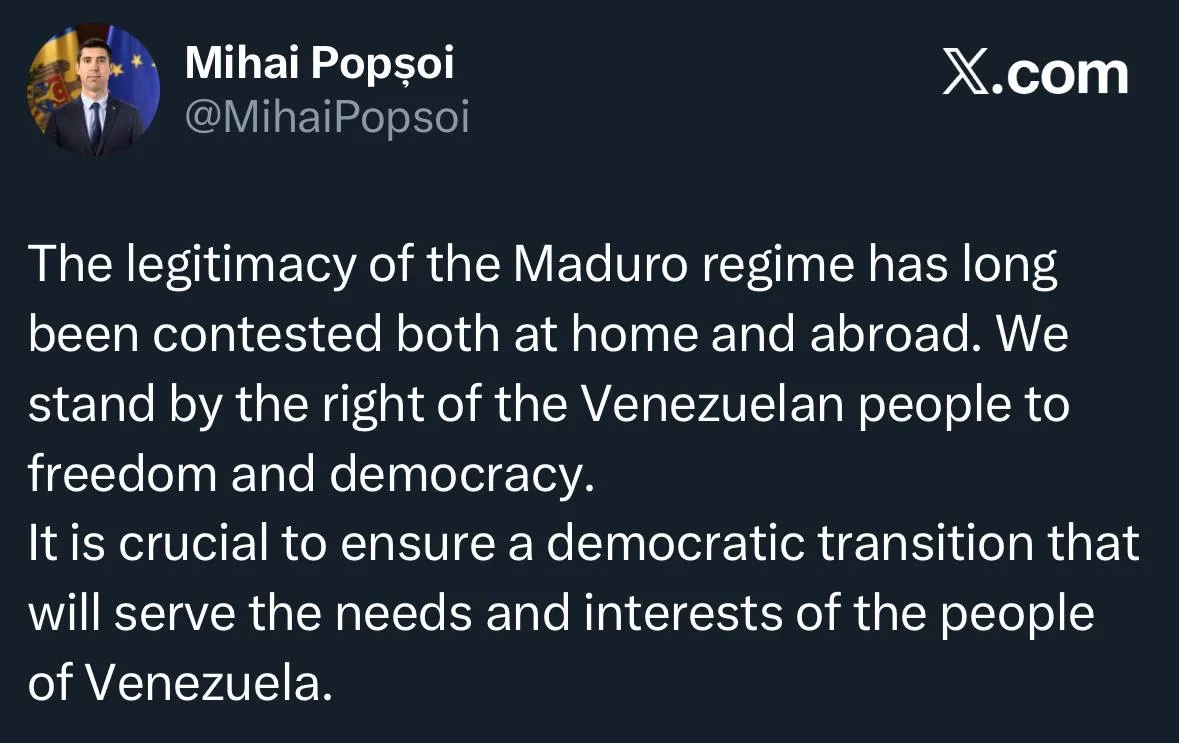 Imagine simbol„Legitimitatea regimului Maduro a fost contestată de mult timp, atât pe plan intern, cât și internațional. Susținem dreptul poporului venezuelean la democrație și libertate”, a scris Mihail Popșoi pe rețelele sociale, transmite Știri.md.