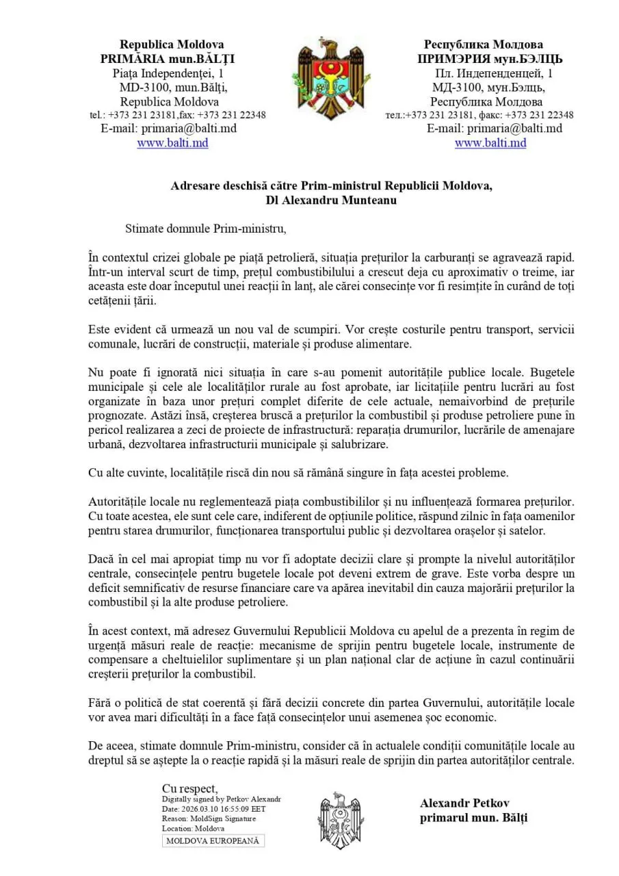 Primarul municipiului Bălți, Alexandr Petkov, i-a adresat o scrisoare deschisă premierului Alexandru Munteanu, în care avertizează că majorarea rapidă a prețurilor la carburanți ar putea provoca probleme serioase pentru bugetele locale și pentru realizarea proiectelor de infrastructură.