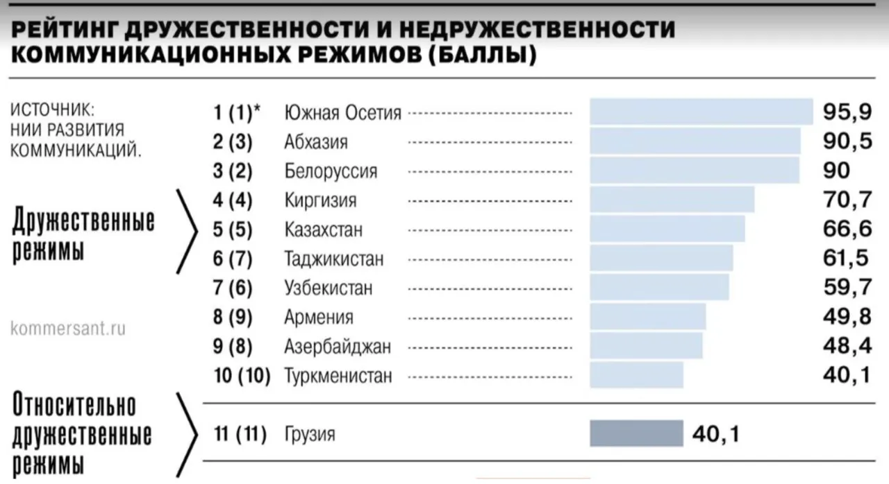 În topul statelor considerate „prietenoase” se află regiunile separatiste Osetia de Sud și Abhazia, urmate de Belarus, Kârgâzstan și Kazahstan. La polul opus, în categoria țărilor „ostile”, sunt plasate Ucraina, statele baltice și Republica Moldova. Clasamentul acordă fiecărui stat un scor de la +100 la –100, în funcție de nivelul de apropiere față de Rusia. Georgia este încadrată drept stat „relativ prietenos”, cu 40,1 puncte, transmite Știri.md cu referire la newsmaker.md.