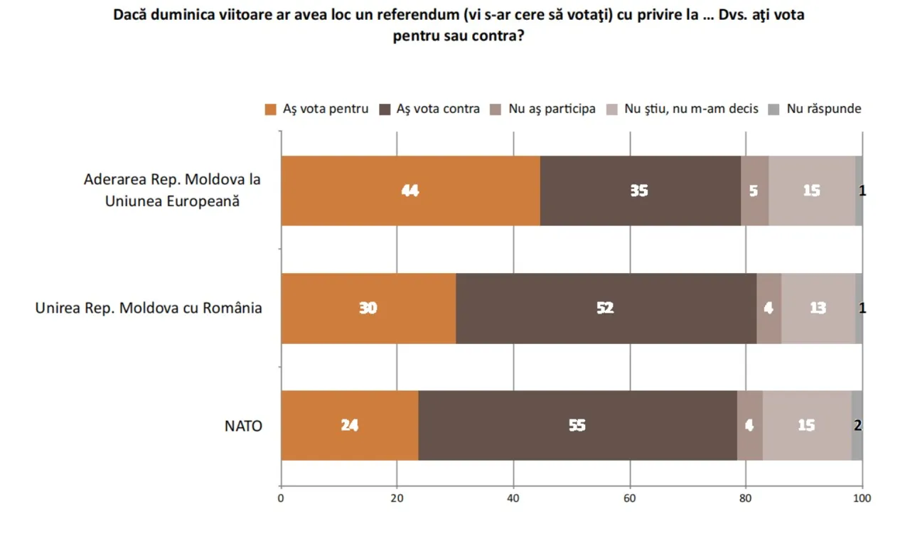 În ceea ce privește Unirea cu România, 30% dintre moldoveni au anunțat că ar vota „pentru”. Totuși, 52% dintre respondenți se opun acestei opțiuni.