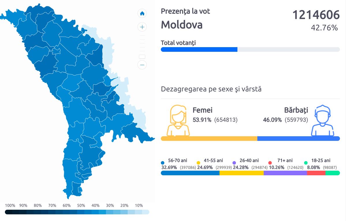 Foto: știri.mdPotrivit datelor oficiale prezentate de Comisia Electorală Centrală (CEC), până la ora 21:00, la alegerile prezidențiale din 1 noiembrie 2020 au participat peste 1.200.000 de cetăţeni ai Republicii Moldova, ceea ce reprezintă 42,76% din numărul total de alegători incluși pe listele electorale.