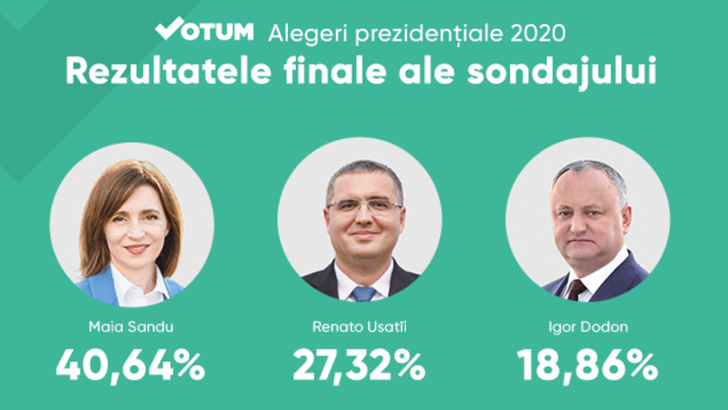 Președintele Republicii Moldova va fi ales în turul II. Cel puțin așa arată rezultatele finale ale studiului lansat pe platforma de sondaje online independente Votum.md, unde niciun candidat nu a acumulat mai mult de 50% din voturi.