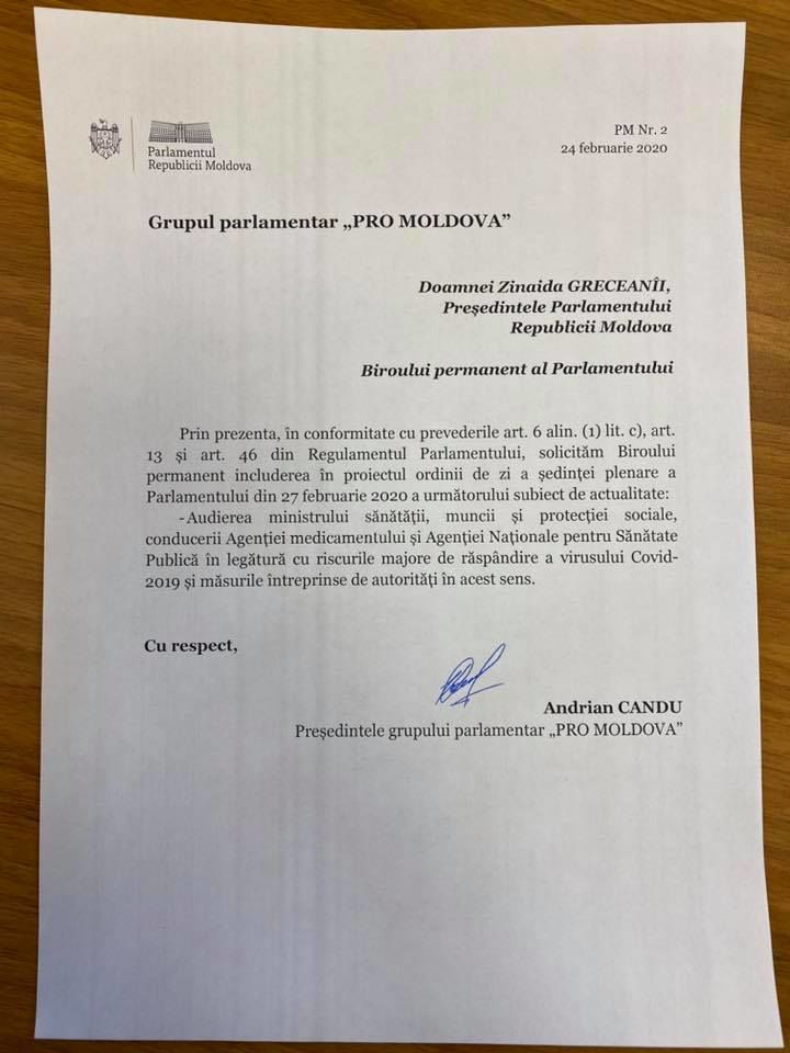 Grupul parlamentar Pro Moldova solicită audierea în plenul Parlamentului a autorităților din domeniul sănătății pe marginea pericolului la care este expusă Republica Moldova în legătură cu epidemia de coronavirus ce se extinde cu repeziciune în Europa și mai cu seamă, în aceste zile, în Italia.