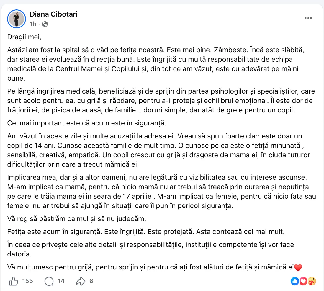 Implicarea mea, dar și a altor oameni, nu are legătură cu vizibilitatea sau cu interese ascunse. M-am implicat ca mamă, pentru că nicio mamă nu ar trebui să treacă prin durerea și neputința pe care le trăia mama ei în seara de 17 aprilie. M-am implicat ca femeie, pentru că nicio fata sau femeie nu ar trebui să ajungă în situații care îi pun în pericol siguranța. Vă rog să păstrăm calmul și să nu judecăm. Fetița este acum în siguranță. Este îngrijită. Este protejată. Asta contează cel mai mult. În ceea ce privește celelalte detalii și responsabilitățile, instituțiile competente își vor face datoria. Vă mulțumesc pentru grijă, pentru sprijin și pentru că ați fost alături de fetiță și mămică ei”.