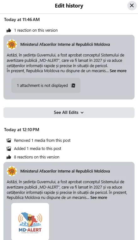 Inițial, în postare a fost adăugată imaginea cu stema Republicii Moldova, distorsionată vădit de inteligența artificială.