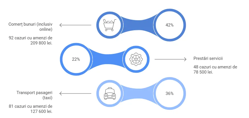 Cele mai frecvente nereguli au fost depistate în domenii precum comerțul cu bunuri, inclusiv prin platforme online, prestarea serviciilor și transportul de pasageri în regim taxi.