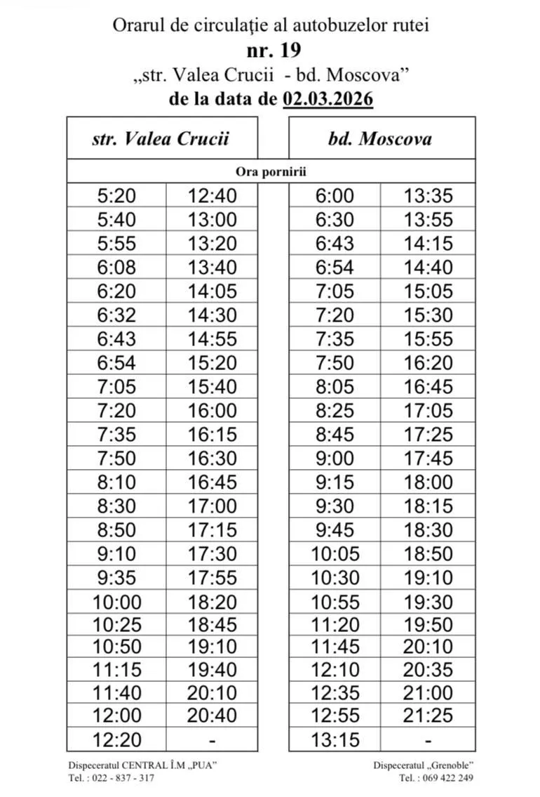 Primăria municipiului Chișinău informează că, începând cu data de 2 martie, vor fi operate modificări în orarul de circulație al rutei urbane de autobuz nr. 19 „str. Valea Crucii - bd. Moscova”.