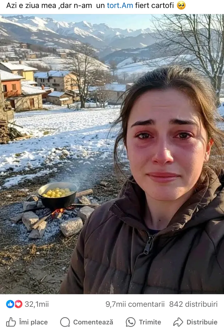 „Cu regret, iată încă un caz distribuit masiv în ultima perioadă pe diverse rețele de socializare. Peste 32.000 de aprecieri a colectat această imagine generată de AI, fiind utilizată pentru a cere donații prin Revolut, dar şi alte instrumente financiare. Multora le-a fost milă că ziua de naștere se petrece cu cartofi fierți și nu cu un „tort” şi au donat (sume deloc mici). Însă puțini sunt cei care au utilizat instrumente de verificare pentru a confirma dacă această poză este reală sau e un fals. Încercați minim să treceți imaginea prin https://wasitai.com/ și să vă convingeți dacă merită să donați pentru „un tort” sau nu”, a scris Dinu Țurcanu.