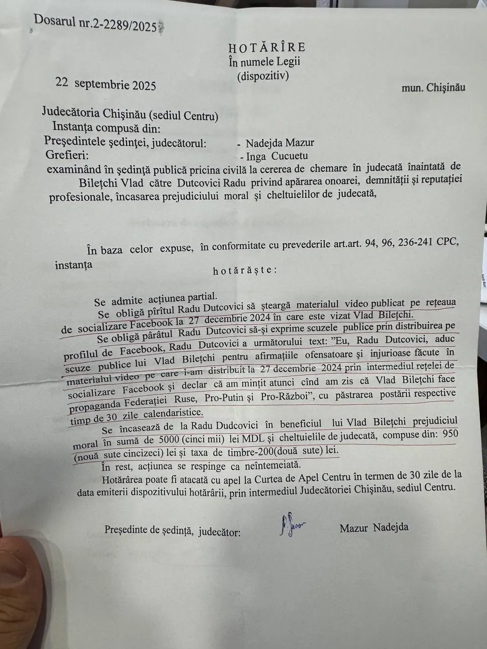 „Radu Dutcovici este obligat de către instanța de judecată să șteargă videoclipul defăimător, să-și ceară scuze public cu un text clar și să păstreze aceste scuze vizibile timp de 30 de zile”, a scris Vlad Bilețchi pe rețelele de socializare.