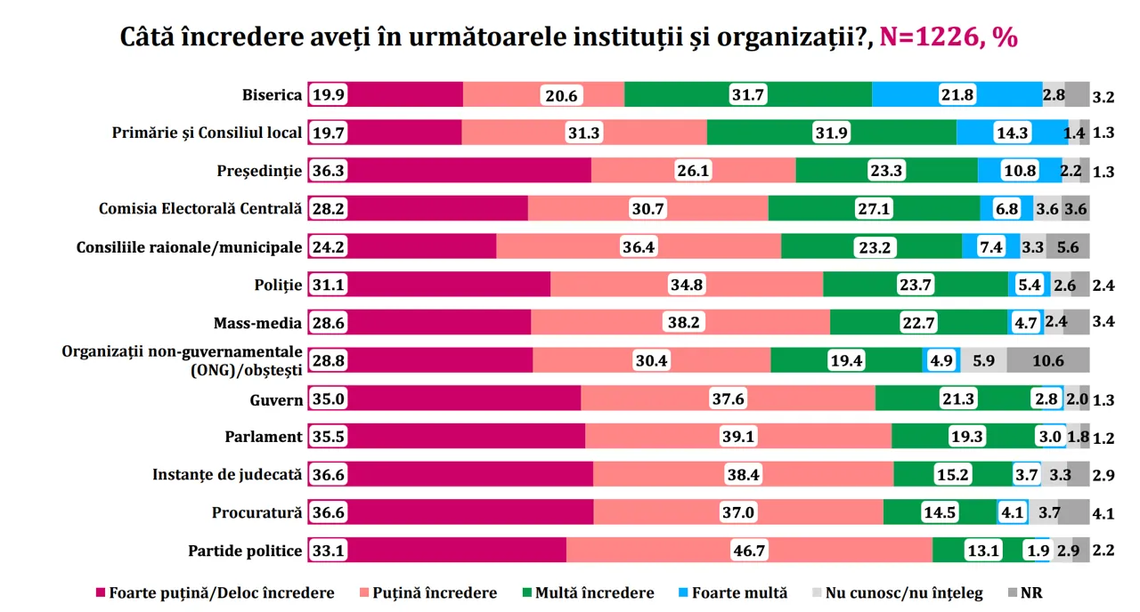Biserica, autoritățile publice locale și Președinția sunt instituțiile în care cetățenii Republicii Moldova au cea mai mare încredere, în timp ce partidele politice, Procuratura și instanțele de judecată se află la polul opus, arată un sondaj realizat la comanda asociației pentru drepturile omului Promo-LEX.