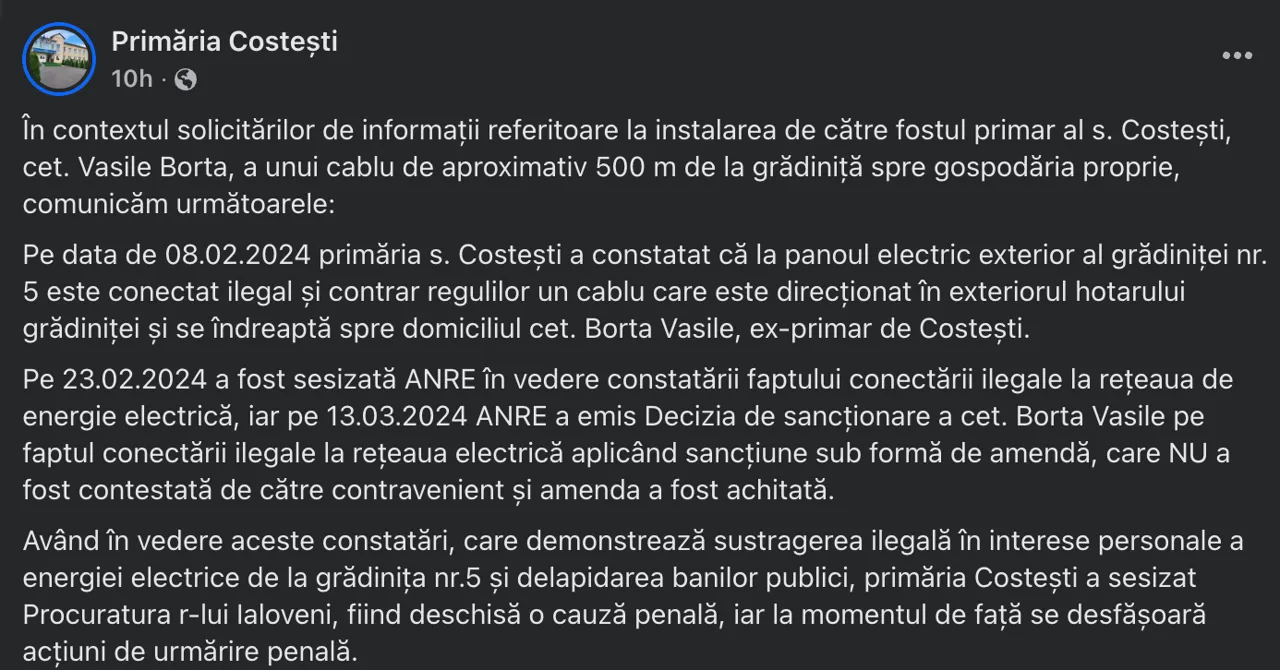 Fostul primar al satului Costești, Vasile Borta, candidat la un nou mandat din partea Partidului Democrația Acasă, a fost sancționat după ce autoritățile au depistat o conexiune ilegală la rețeaua electrică a unei grădinițe din localitate. Pe numele acestuia a fost inițiată și o cauză penală.