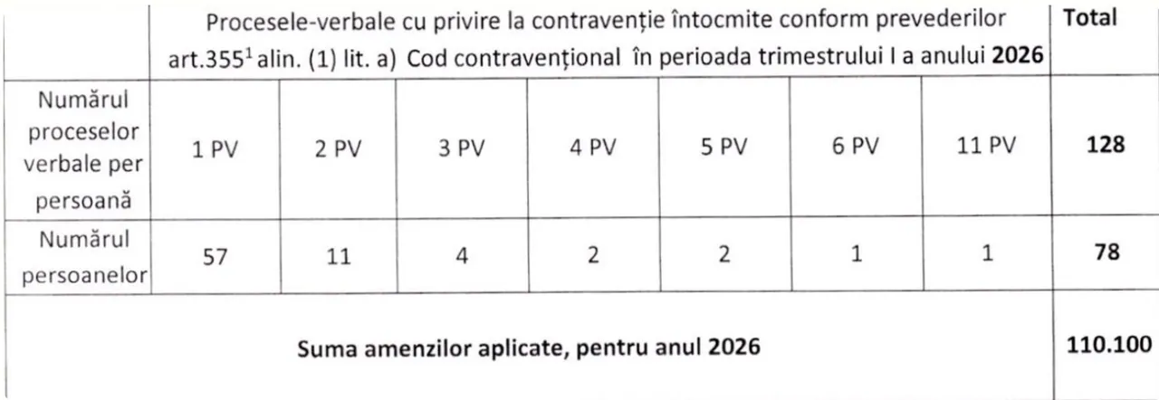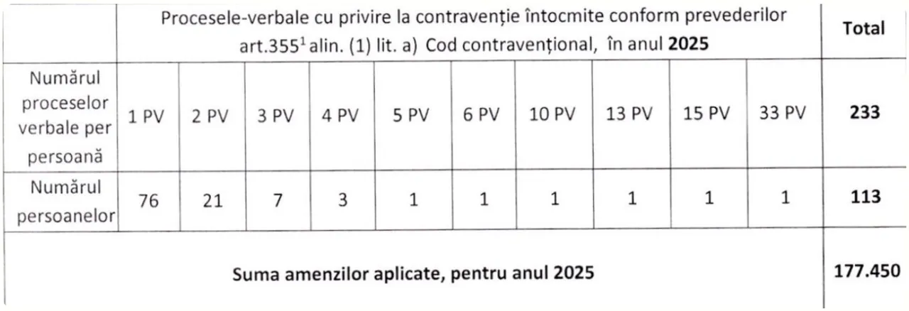 Pentru întreg anul 2025, poliția a documentat 113 persoane implicate în astfel de fapte, aplicând amenzi în sumă totală de 177.450 de lei. Un caz aparte a vizat o persoană care a acumulat 33 de procese-verbale pentru simularea dizabilității în scopul obținerii de bani.