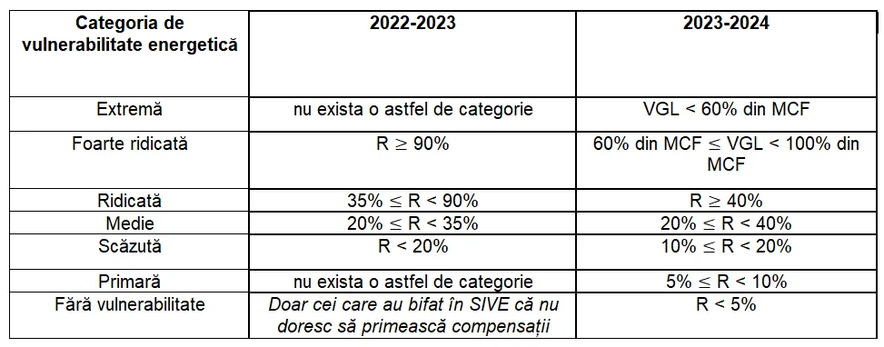 - Categoria de vulnerabilitate ridicată, dacă energia ar reprezenta peste 40% din venitul disponibil pentru achitarea energiei (după acoperirea cheltuielilor de bază);