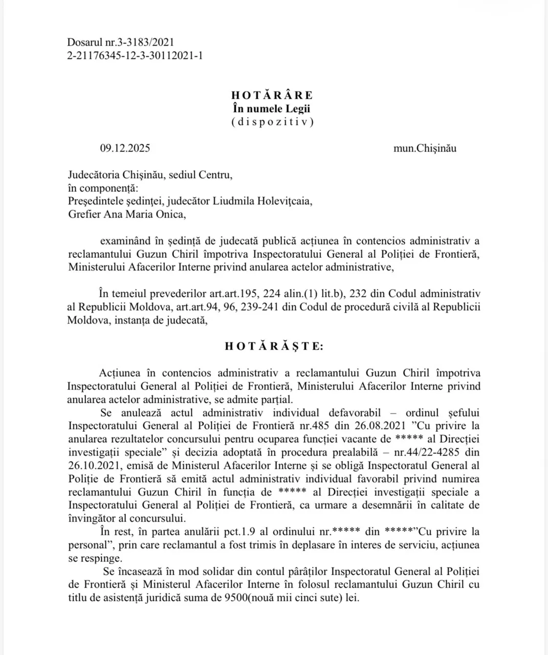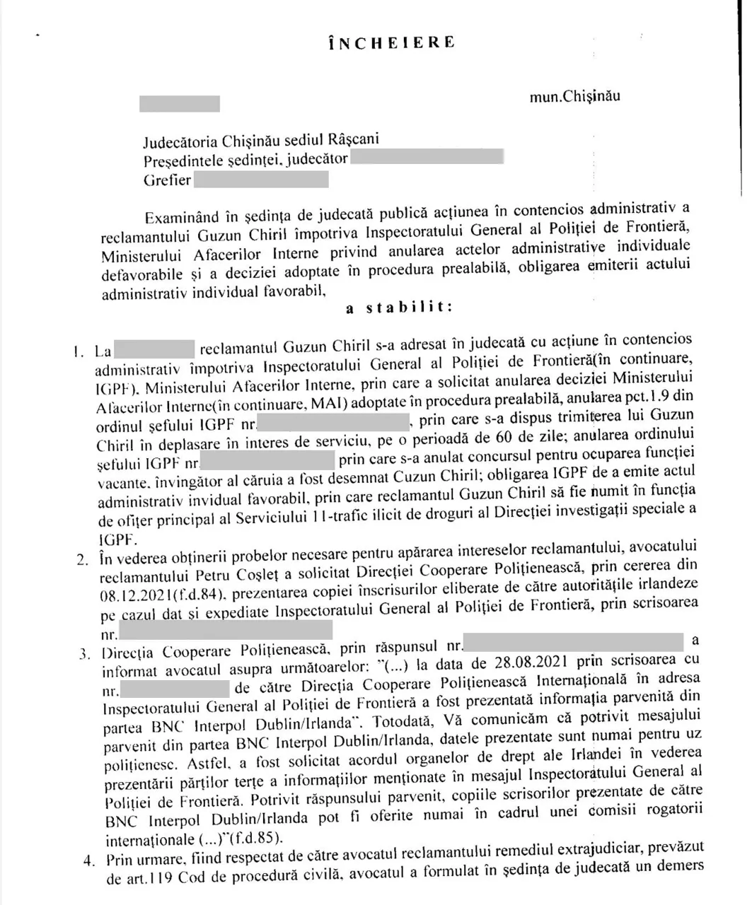 Chiril Guzun, fost angajat al Inspectoratului General al Poliției de Frontieră, solicită publicarea unei dezmințiri după ce a pierdut litigiul cu instituția, susținând că informațiile privind legalitatea încetării raporturilor sale de serviciu ar fi eronate și contrazise de hotărâri judecătorești definitive.
