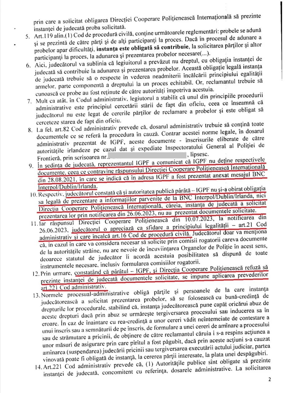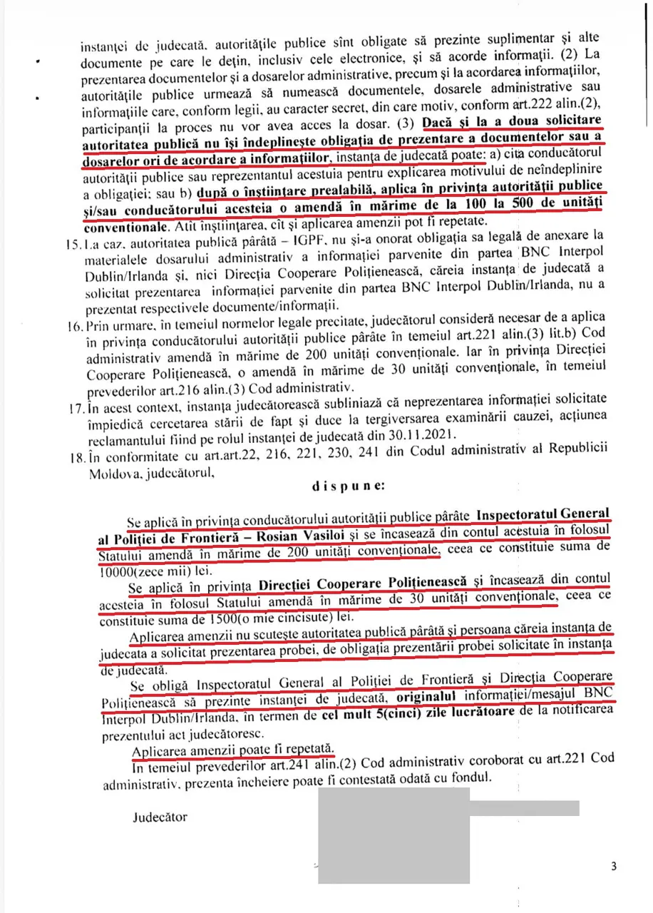 2. Instituțiile vizate (Poliția de Frontieră și Ministerul Afacerilor Interne al Republicii Moldova) au fost sancționate de instanțele de judecată pentru neprezentarea probelor în original, fiind depuse doar înscrisuri cu caracter informativ intern, fără forță probantă conform dispozițiilor procedurale (anexez deciziile).