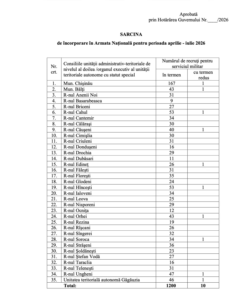 În același timp, cel mult 10 recruți vor exercita serviciul militar în termen redus. Aceștia sunt originari din Chișinău, Bălți, Cahul, Căușeni, Edineț, Hâncești, Orhei, Soroca, Ungheni și Găgăuzia.