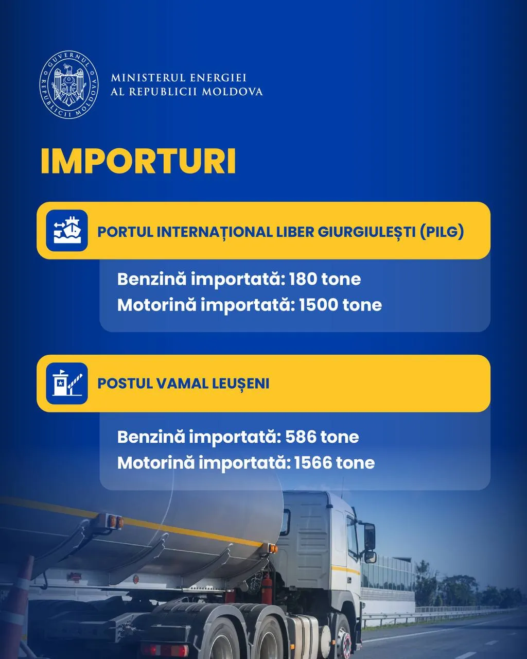 Imagine simbol„Astăzi, prin Portul Internațional Liber Giurgiulești au fost importate 180 tone de benzină și 1.500 tone de motorină. Totodată, prin postul vamal Leușeni au intrat în țară 586 tone de benzină și 1.566 tone de motorină”, au menționat reprezentanții Ministerului Energiei, transmite Știri.md.