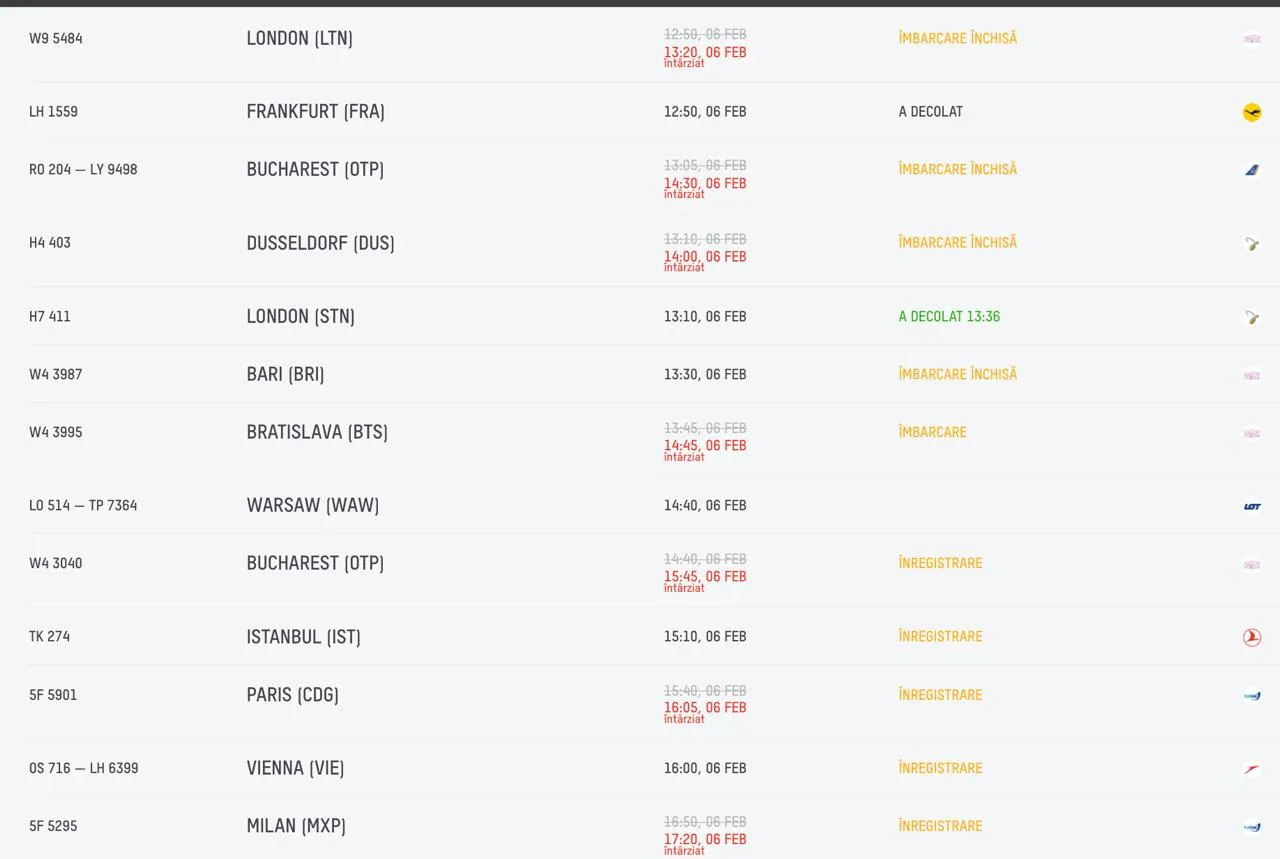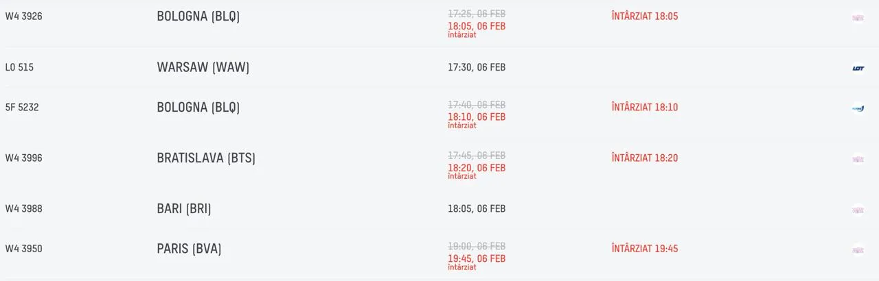 Și la sosiri sunt înregistrate rețineri pe cursele Paris, Bratislava, Bologna.