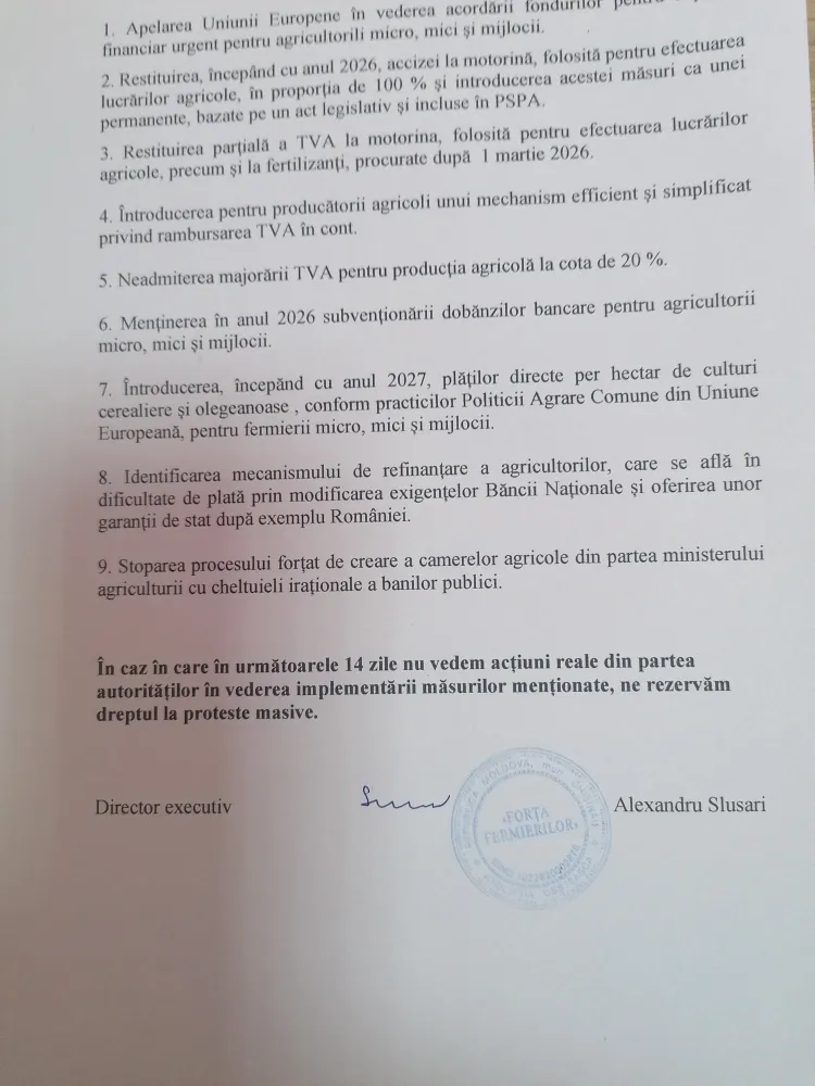 Fermierii avertizează că în cazul în care în următoarele 14 zile nu vor vedea acțiuni reale din partea autorităților, în vederea implementării măsurilor menționate, își vor rezerva dreptul la proteste masive.
