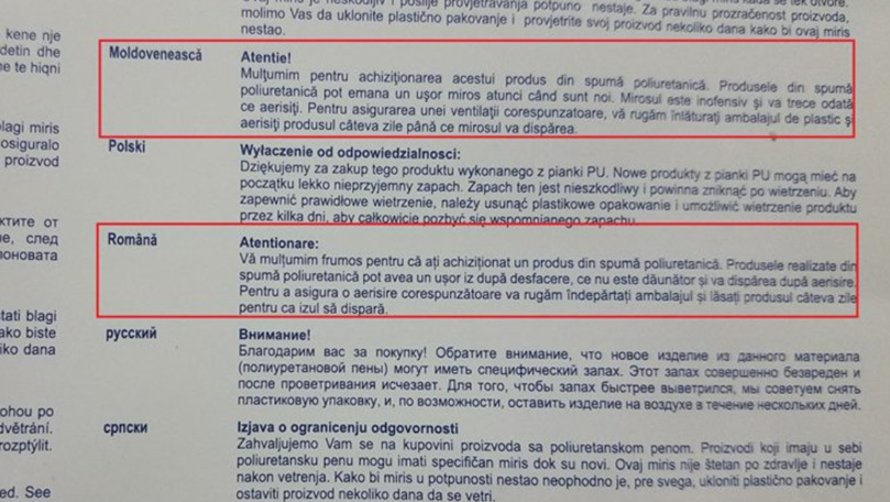 O firmă cunoscută pentru producerea saltelelor s-a gândit să dea descrierea produsului și în română și în „moldovenească”, transmite Știri.md cu referire la Unimedia.