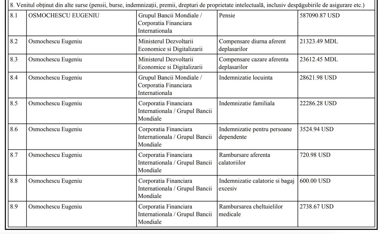 Pe lângă această sumă, Eugeniu Osmochescu a mai beneficiat și de alte indemnizații aferente activității sale în cadrul Grupului Băncii Mondiale.