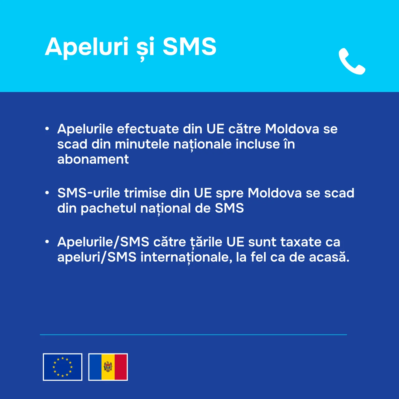 Imagine simbolPotrivit reprezentanților MDED, apelurile efectuate din UE către Moldova se scad din minutele naționale incluse în abonament, iar SMS-urile trimise din UE spre Moldova se scad din pachetul național de SMS, transmite Știri.md.