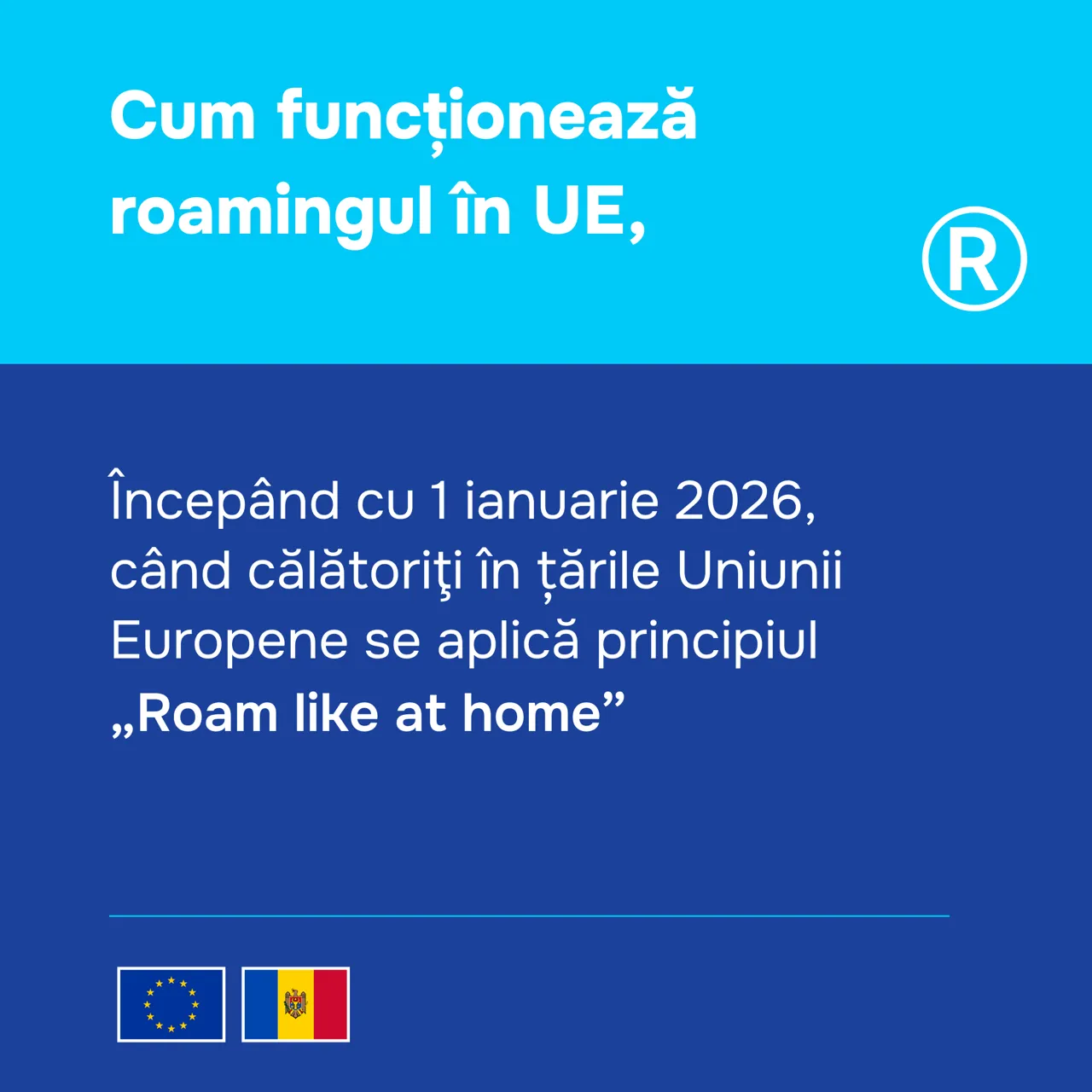 Începând cu 1 ianuarie 2026, călătorii din Moldova nu plătesc taxe suplimentare de roaming pentru apeluri, SMS sau internet mobil întrucât se aplică principiul „Roam like at home”. Ministerul Dezvoltării Economice și Digitalizării (MDED) a venit cu mai multe explicații referitor la această schimbare, menționând că se folosesc minutele, SMS-urile și datele incluse deja în abonamentul sau cartela utilizatorului din Moldova.