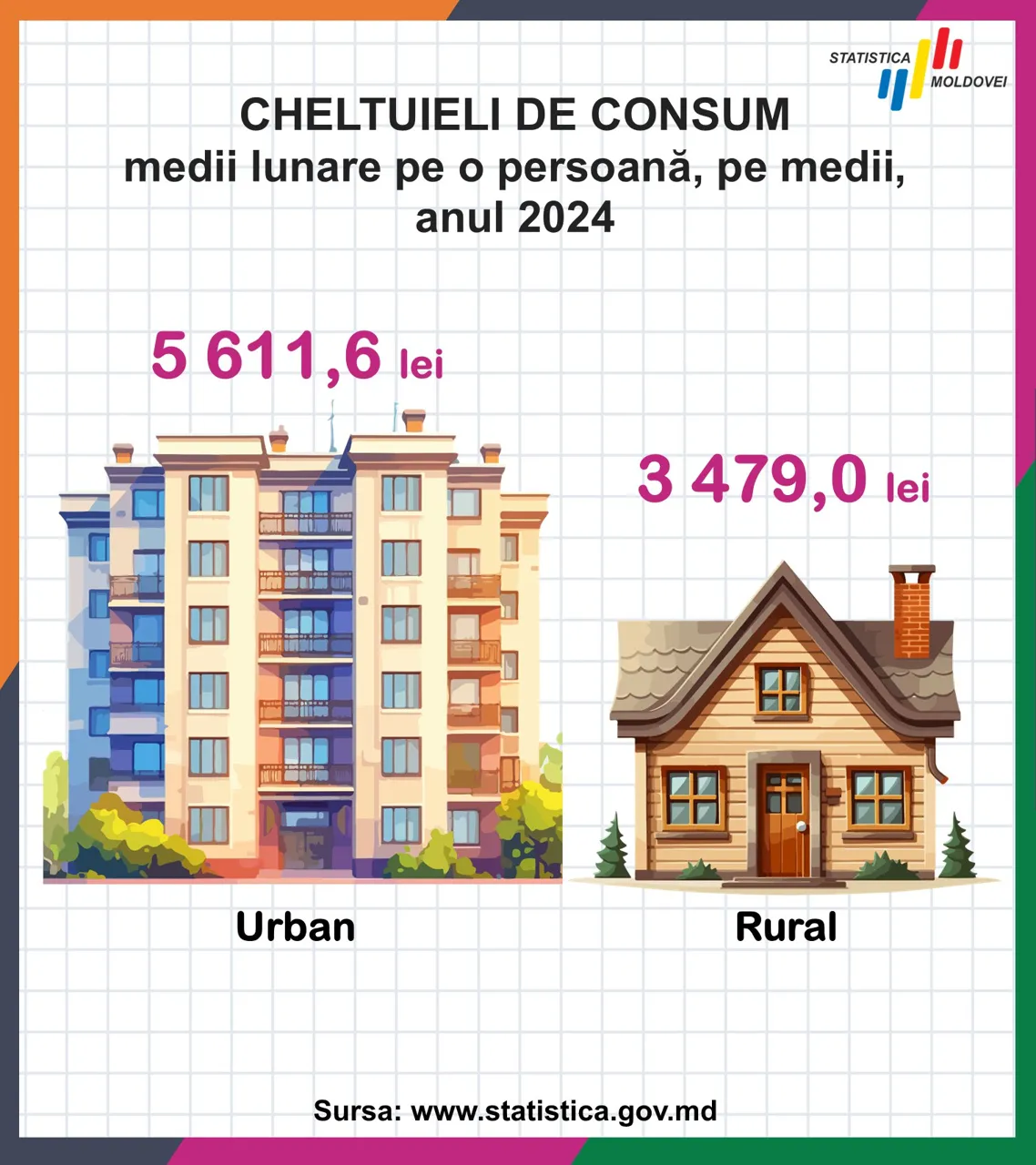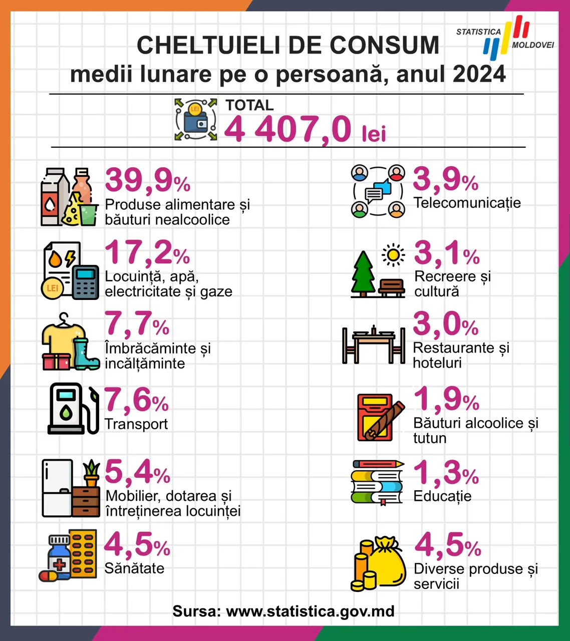 Din cei peste 4.400 lei, moldovenii cheltuiau cel mai mult pentru produsele alimentare și băuturi nealcoolice (circa 39,9%), locuință, apă, electricitate și gaze (17,2%) și îmbrăcăminte (aproximativ 7,7%).