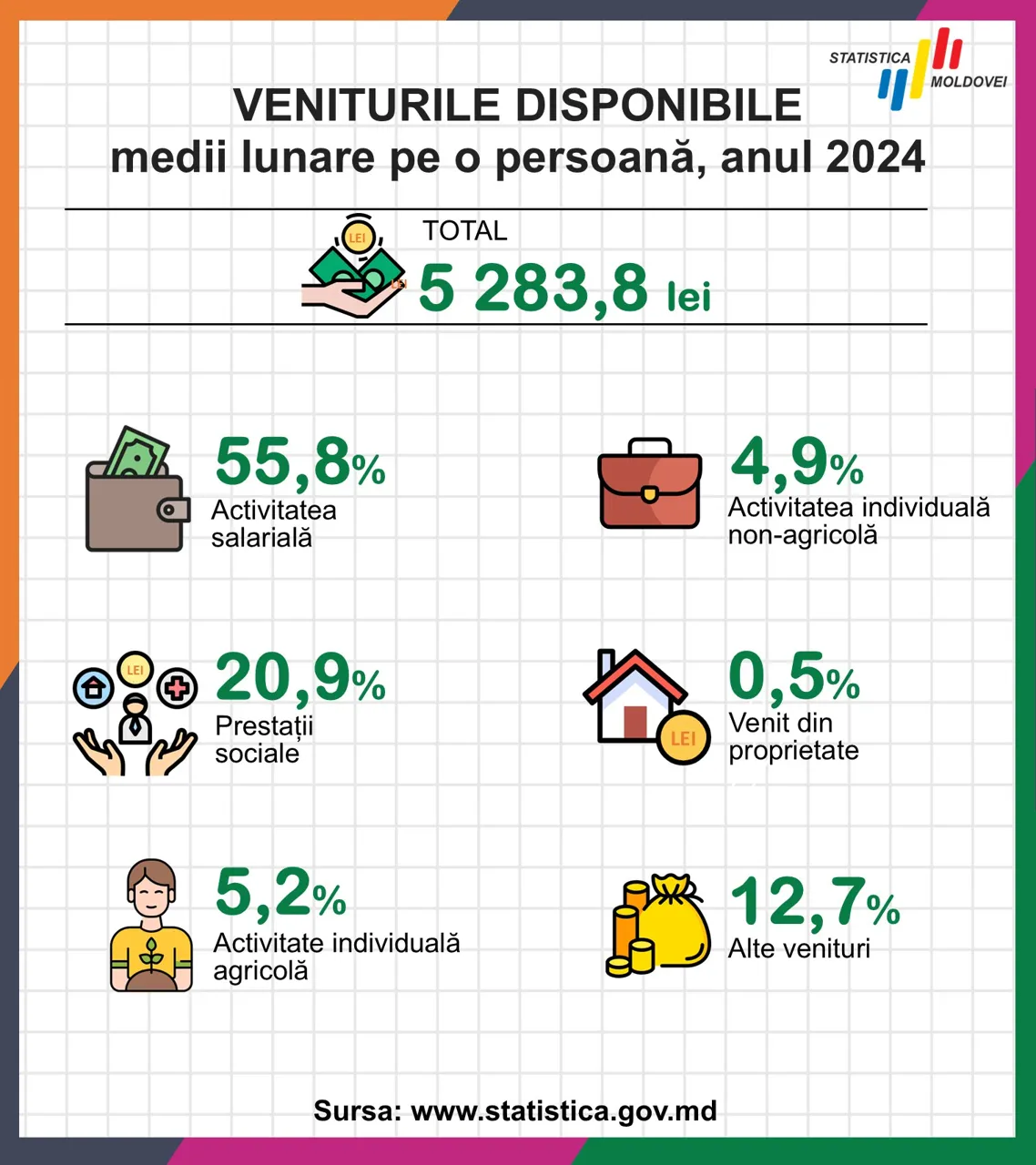 Imagine simbolCu această ocazie, reprezentanții BNS au prezentat câteva infografice bazate pe date statistice oficiale despre: structura veniturilor gospodăriilor; structura cheltuielilor gospodăriilor; veniturile și cheltuielile gospodăriilor din mediul urban și rural, transmite Știri.md.