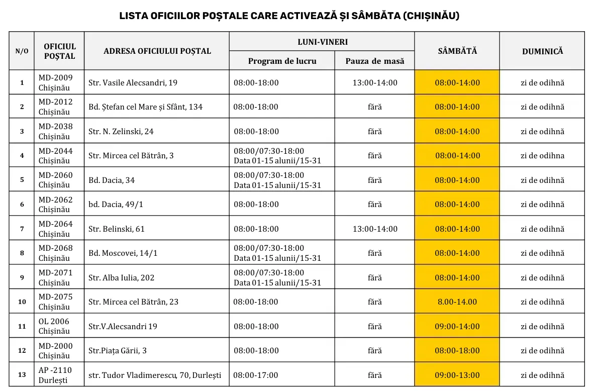 Î.S „Poșta Moldovei” aduce la cunoștință următoarele informații privind programul de activitate a subunităților poștale în zilele de sărbătoare.