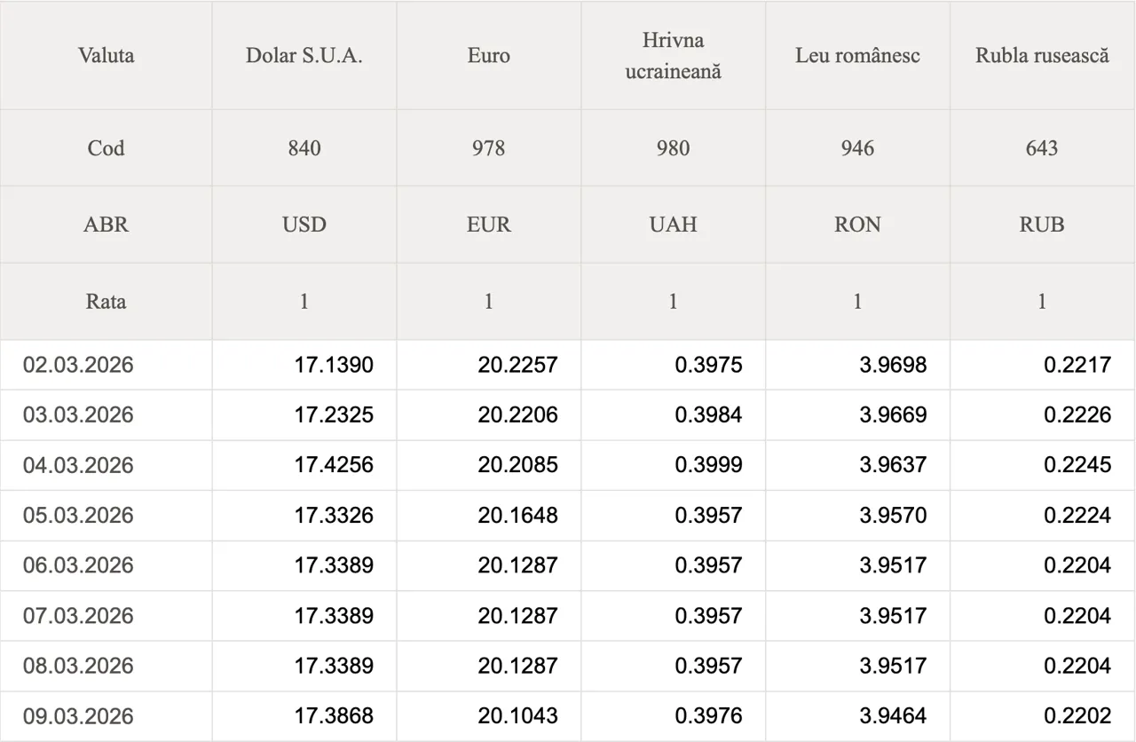 Banca Națională a Moldovei (BNM) a stabilit datele oficiale de schimb valutar pentru astăzi.