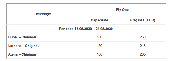 Astfel, compania aeriană „Fly One” S.R.L. va efectua cursele charter de repatriere pe direcțiile: Dubai, Larnaka, Atena.