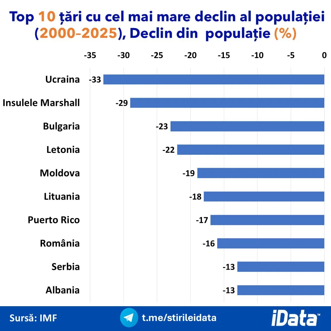 În același clasament, alte țări din regiune confirmă tendința regională de depopulare: Lituania (-18%), România (-16%), Serbia (-13%) și Albania (-13%).
