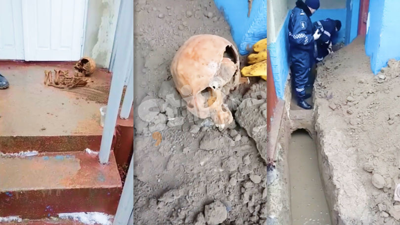 Colaj: Știri.mdRămășițele au fost găsite de muncitorii care efectuau săpături sub fundația locuinței. Potrivit imaginilor video realizate la fața locului, din pământ au fost scoase un craniu, o mandibulă, dinți și alte fragmente osoase, transmite Știri.md.