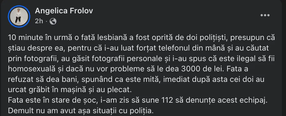 Administratoarea Centrului Genderdoc-M, Angelica Frolov, susține că o tânără ar fi fost oprită de polițiști în sectorul Botanica al Capitalei, iar după ce ar fi văzut în telefon că aceasta ar fi homosexuală, oamenii legii i-ar fi cerut bani. Inspectoratul General al Poliției respinge acuzațiile și afirmă că intervenția a avut loc din cauza unui comportament considerat suspect.