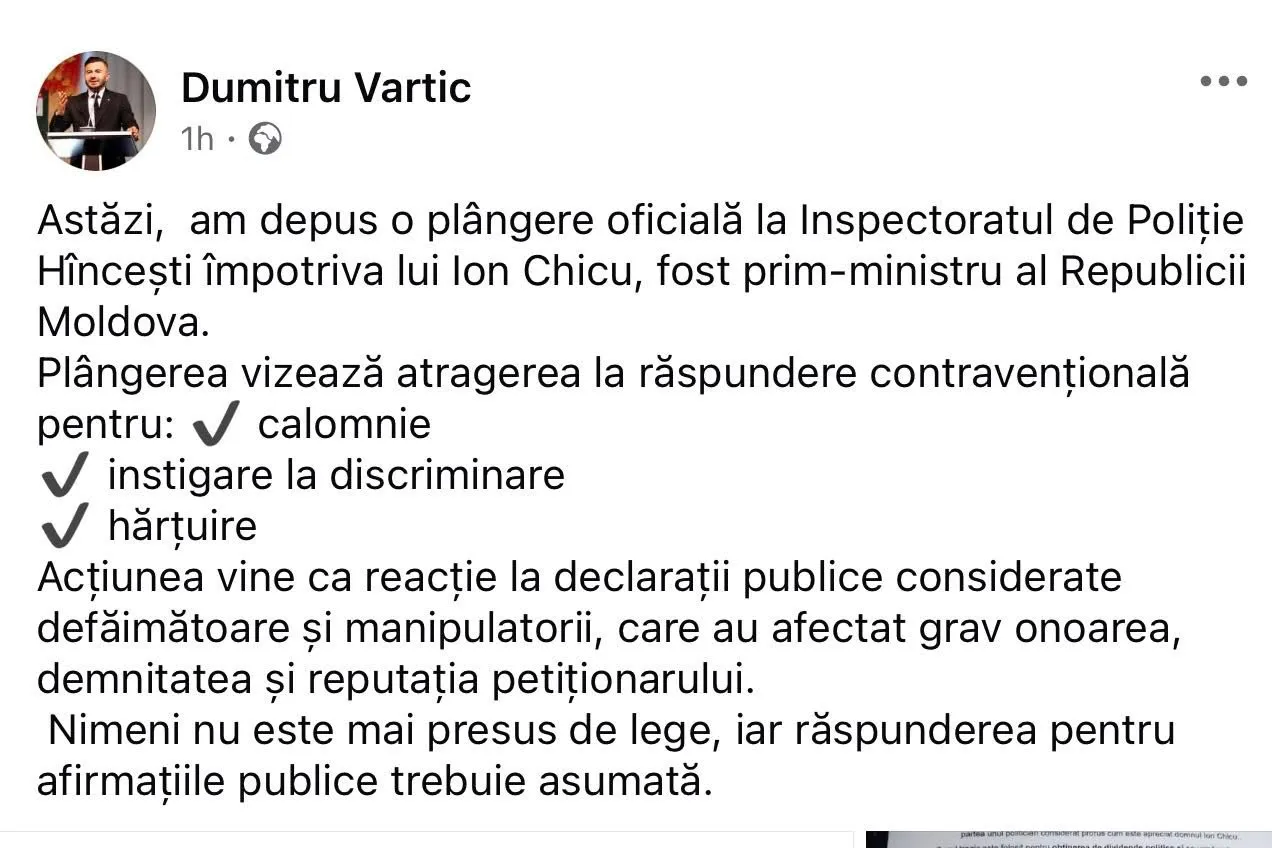 „Acțiunea vine ca reacție la declarații publice considerate defăimătoare și manipulatorii, care au afectat grav onoarea, demnitatea și reputația petiționarului. Nimeni nu este mai presus de lege, iar răspunderea pentru afirmațiile publice trebuie asumată”, a declarat Dumitru Vartic.