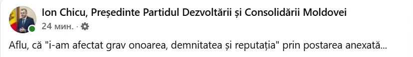 La scurt timp, Ion Chicu a venit cu o reacție: „Aflu, că „i-am afectat grav onoarea, demnitatea și reputația” prin postarea anexată...”
