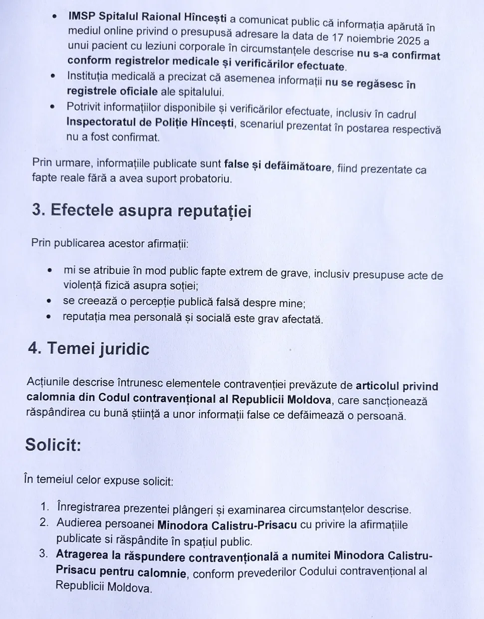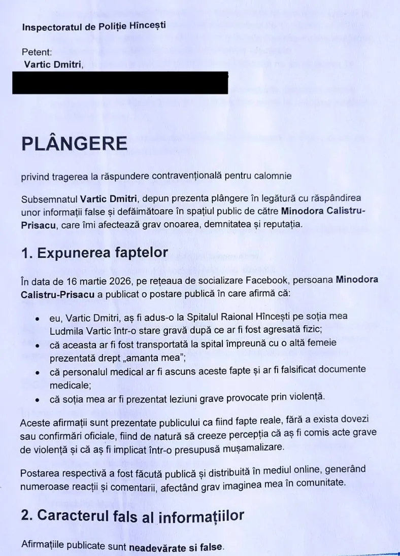 Plângerea depusă la Poliție vizează o postare publicată pe Facebook de Minodora Calistru-Prisacu, în care sunt prezentate informații despre circumstanțele în care Ludmila Vartic ar fi ajuns la Spitalul Raional Hâncești în noiembrie 2025. Spitalul din Hâncești a negat ieri aceste informații.