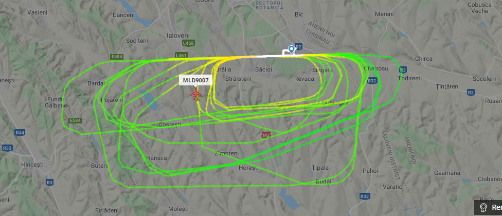 Un avion face cercuri deasupra Aeroportului Chișinău. Potrivit flightradar24.com, acesta a făcut deja circa 15 cercuri.