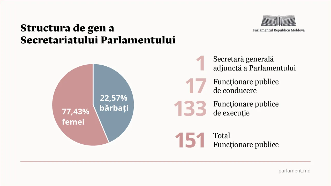 Femeile reprezintă majoritatea și în cadrul Secretariatului Parlamentului. Potrivit datelor instituției, 151 de femei activează în calitate de funcționari publici, ceea ce constituie peste 77% din totalul personalului. Tamara Gheorghița ocupă funcția de secretară generală adjunctă, alte 17 femei dețin funcții publice de conducere, iar 133 activează în funcții de execuție.