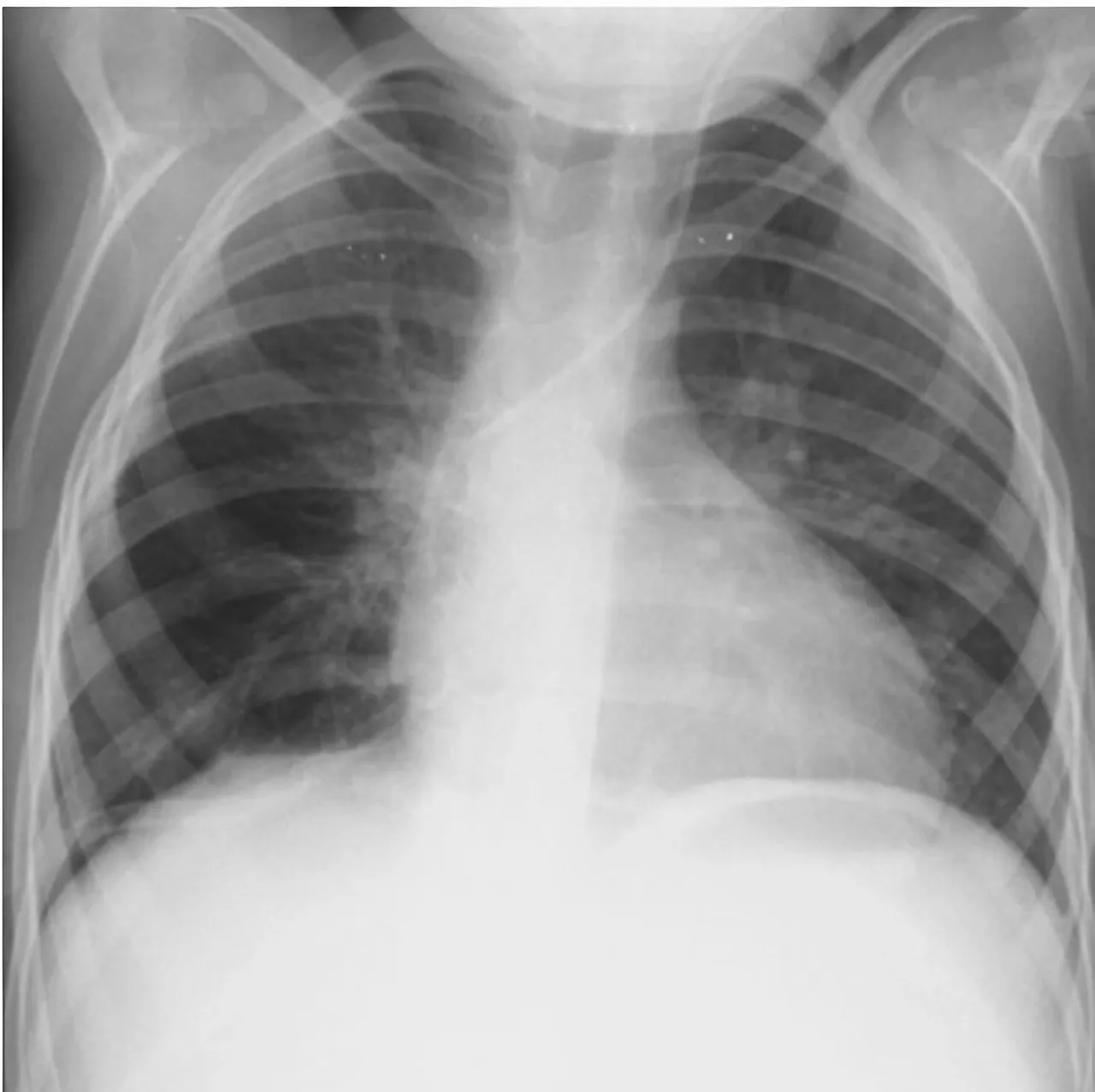 Tomografia a sugerat un caracter multicomponențial al formațiunii, cu suspiciune de teratom, fiind menționată și asocierea cu o anomalie vasculară rară – artera subclavie dreaptă aberantă.