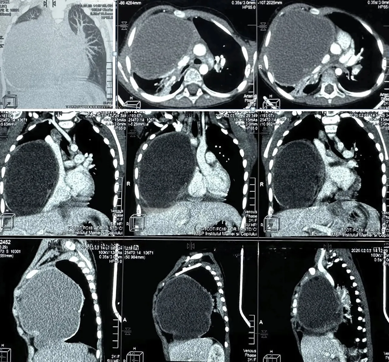Investigațiile imagistice efectuate în cadrul serviciului de radiologie și medicină nucleară au arătat o situație gravă: o formațiune tumorală de aproximativ 12 x 9 x 10 cm, localizată în hemitoracele drept. Potrivit medicilor, tumora ocupa circa 80% din cavitatea pleurală, comprimând aproape în totalitate plămânul drept și exercitând presiune severă asupra structurilor mediastinale.