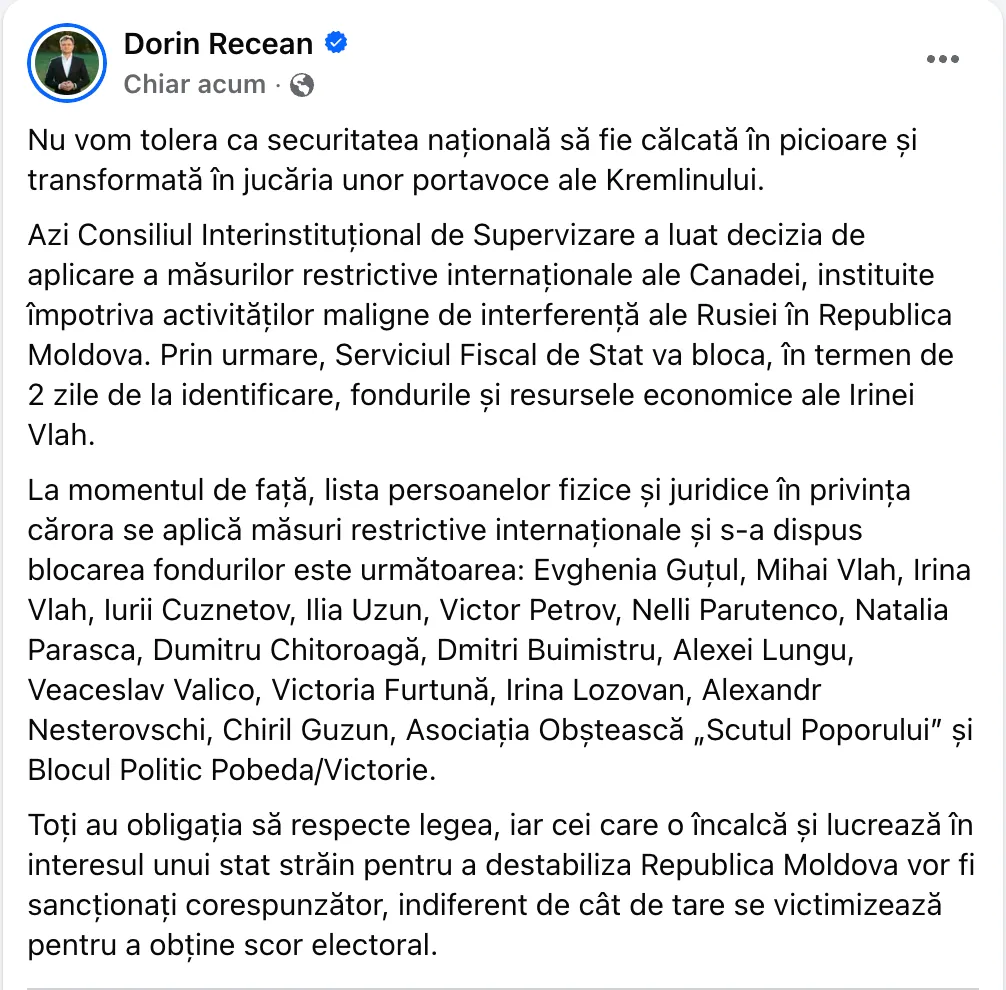 Serviciul Fiscal de Stat va bloca, în termen de două zile de la identificare, fondurile și resursele economice ale Irinei Vlah. Anunțul a fost făcut de premierul Dorin Recean, în contextul în care Consiliul Interinstituțional de Supervizare a luat decizia de aplicare a măsurilor restrictive internaționale ale Canadei, instituite împotriva activităților maligne de interferență ale Rusiei în Republica Moldova.