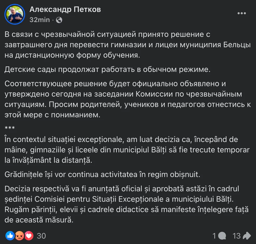 „Decizia respectivă va fi anunțată oficial și aprobată astăzi în cadrul ședinței Comisiei pentru Situații Excepționale a municipiului Bălți. Rugăm părinții, elevii și cadrele didactice să manifeste înțelegere față de această măsură”, a notat edilul.