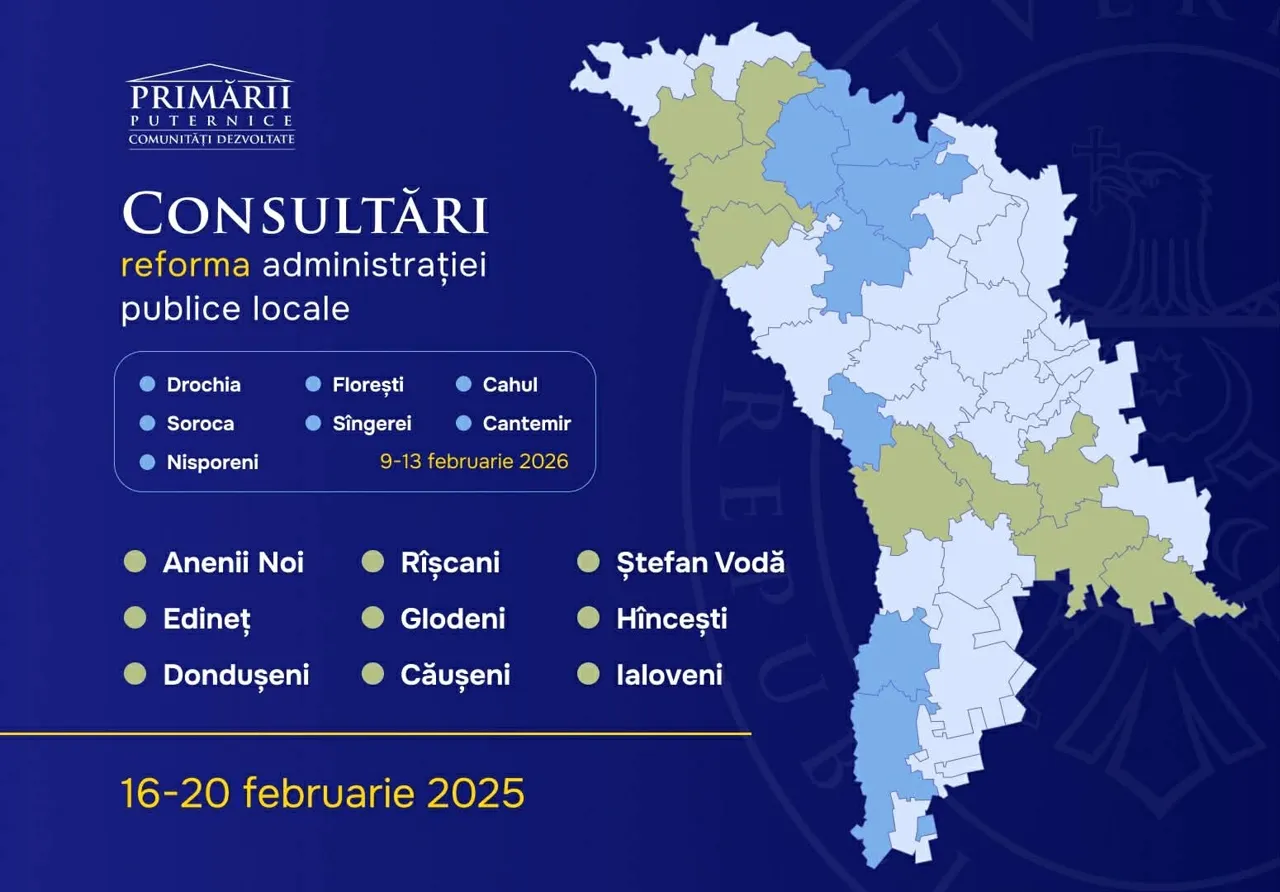 Reforma administrației publice locale a fost discutată, în perioada 16–20 februarie, cu cetățenii și aleșii locali din nouă raioane. Reprezentanții Guvernului au organizat consultări la Edineț, Dondușeni, Râșcani, Glodeni, Anenii Noi, Căușeni, Ștefan Vodă, Hâncești și Ialoveni, unde au colectat opiniile comunităților și așteptările acestora privind schimbările propuse.