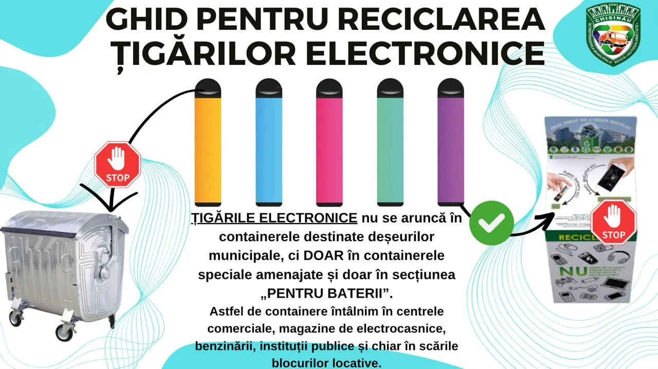 Astfel, Î.M Regia „Autosalubritate” recomandă utilizatorilor de țigări electronice să nu arunce puff-urile uzate în containerele destinate deșeurilor municipale de la platformele comune de stocare, dar în tomberoanele special amenajate pentru colectarea dispozitivelor electrice și electronice uzate.